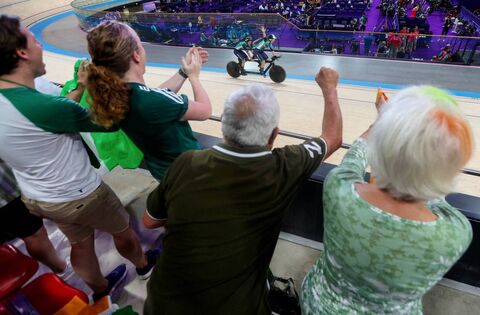 John and Alana Dunlevy cheer on their daughter Katie-George and her pilot Eve McCrystal after their silver medal win in the Women's 'B' 3000m track cycling at the 2024 Paris Paralympic Games last Sunday. Picture: INPHO/Tom Maher