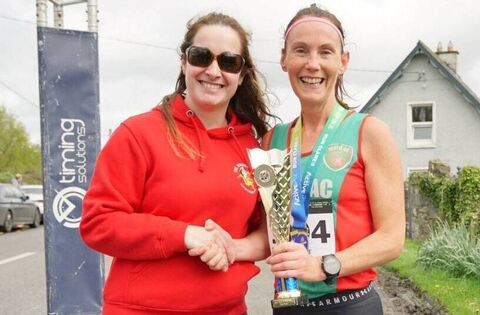 Paula Donnellan Walsh of Mayo AC accepts her prize for finishing second in the Kilkishen 10 mile where she ran a personal best time.