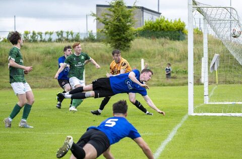 Feeling blue: Claremorris (in green) found the net three times against Kiltimagh/Knock United but problems at the other end see them bottom of the Super League table. It looks likely they will stay there but stranger things have happened. Picture: John Corless