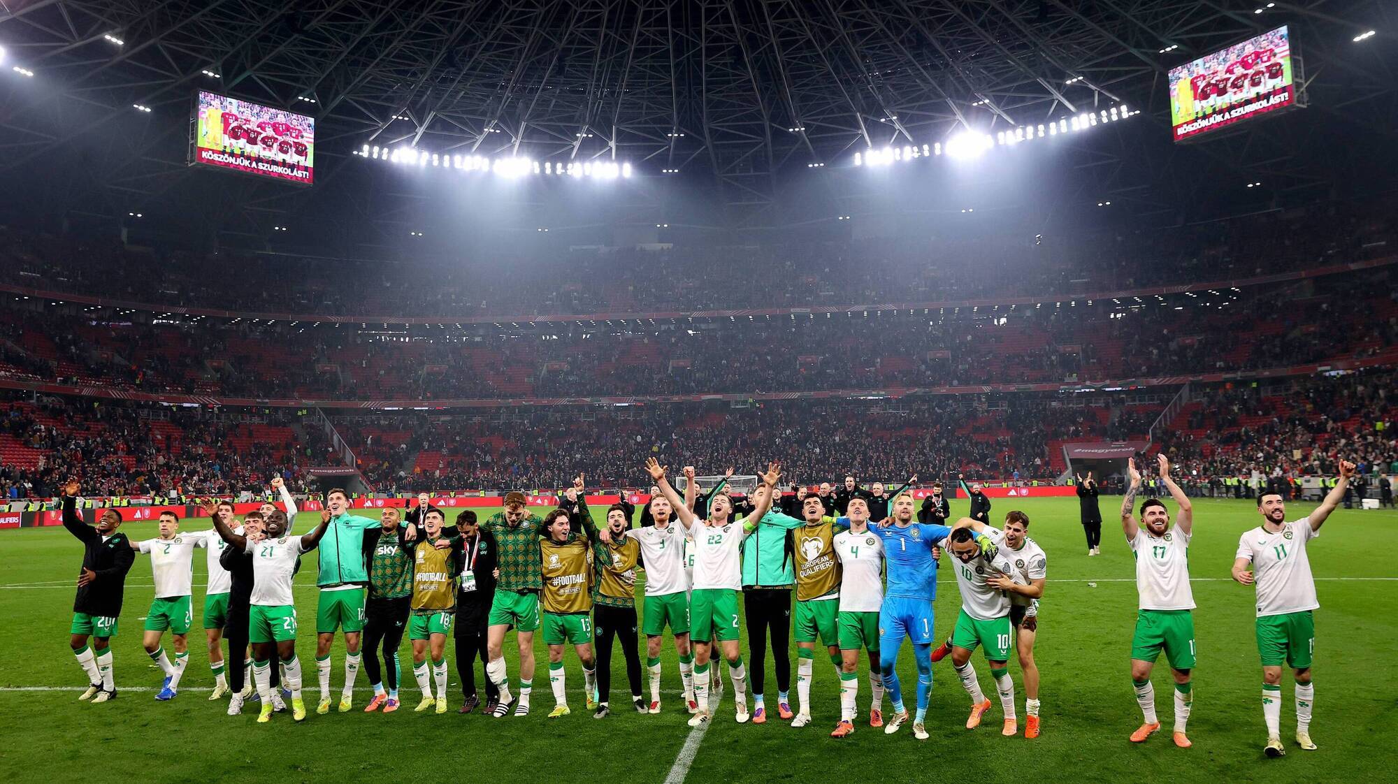 Republic of Ireland Ireland players celebrate after their dramatic 3-2 win against Hungary in the 2026 FIFA World Cup Group F Qualifier at the Puskás Aréna, Budapest. Picture: INPHO/Ryan Byrne