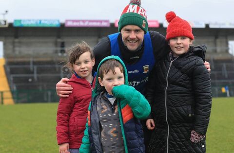 Mayo manager Andy Moran with his Roscommon supporting nieces Aoibhe and Blaithín and nephew Fergal after last Suinday's FBD League Round 2 clash at King & Moffatt Dr Hyde Park. Picture: Bernie O'Farrell