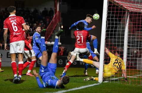 Tommy Lonergan of Waterford heads his side's second goal during the SSE Airtricity Men's Premier Division match between Sligo Rovers and Waterford at The Showgrounds in Sligo. Phicture: Stephen McCarthy/Sportsfile