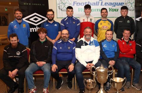 Captains and managers of the Mayo Football League's Division 2 clubs, at Umbro Park Milebush, ahead of next weekend's kick-off of their 2024 season. Pictures: Michael Donnelly