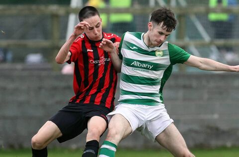 Castlebar Celtic's Oran Groarke holds off the challenge of Westport United's Jack Dawson. Picture: Castlebar Celtic FC