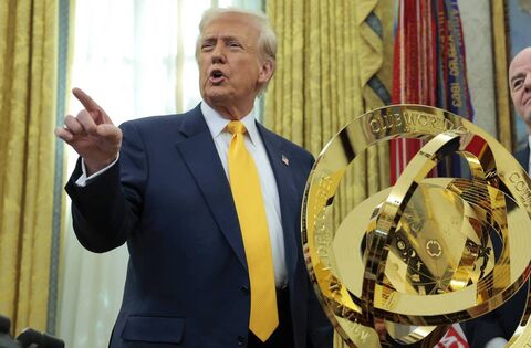 President Donald Trump speaks alongside FIFA President Gianni Infantino after unveiling the 2025 Club World Cup trophy in the Oval Office at the White House on March 7. President Trump signed an executive order establishing a White House Task Force for the 2026 World Cup. Picture: Anna Moneymaker/Getty Images