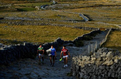 Michael Fitzsimons of Dublin with the Sam Maguire Cup, Shane Enright of Kerry, left, and Damien Comer of Galway, making their way to the launch of the 2018 All-Ireland SFC at Dún Aonghasa on Inishmore in the Aran Islands. Picture: Brendan Moran/Sportsfile