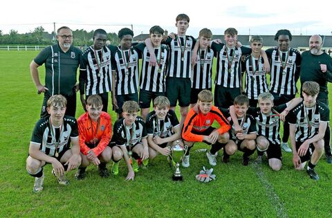 Castlebar Town celebrate as winners of the Henry Downes U17 Cup Final after their win over Iorras Aontaithe at Umbro Park. Pictures: Conor McKeown