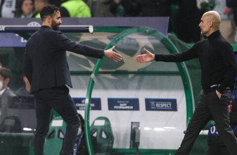 Ruben Amorim, now Manchester United manager, greets Manchester City boss Pep Guardiola during his time in charge of Sporting Lisbon who beat City 4-1 in last month's UEFA Champions League match at the Jose Alvalade stadium in Lisbon. Picture: Carlos Costa/AFP via Getty Images