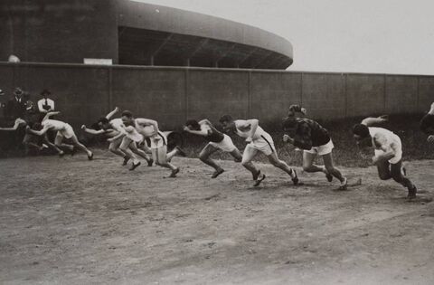 A group of sprinters work on their race start in training at the Paris 1924 Olympic Games in Colombes. The athletes are unnamed but legendary Mayo GAA footballer Sean 'Baller' Lavan represented Ireland in both the 200-metre and 400-metre events. Picture: Archives CNOSF/AFP via Getty Images