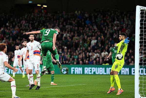Avagyan managed to claw away Nathan Collins’ header from a Manning cross seconds later and then made a stunning save from O’Shea’s deflected header as Ireland sensed their opportunity, but a lack of precision continued to let them down.