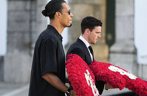 Virgil van Dijk and Andy Robertson each carried a floral tribute in the shape of a red shirt.