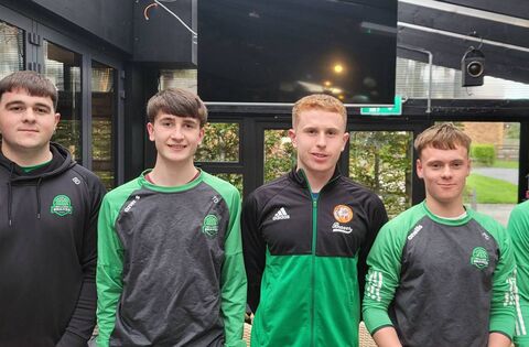 Members of the Team Merry Monk Ballina under-20 side, from left: Brian Donohoe, forward, Theo Daly, guard, Barry Walsh, forward, Conor Burke, guard and Mark Cunningham, guard.