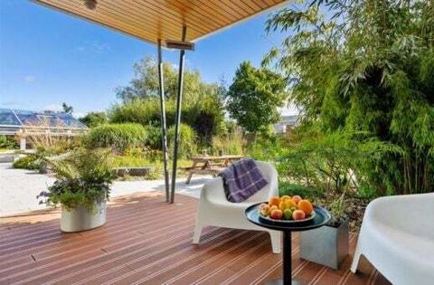 While being in the heart of the town, wall glazing running the full length of the house offers a view normally reserved for countryside living, with lush gardens, mature trees, patios and meandering pathways.