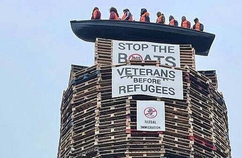 The boat containing more than a dozen life-sized mannequins wearing life jackets was unveiled on top of the bonfire. Below the boat are several placards, one stating “stop the boats” and another “veterans before refugees”.
