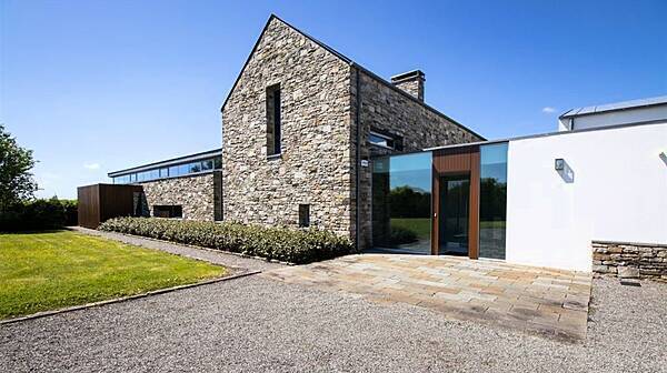 Curraghmore House is a home set on over two acres of countryside. Natural stone, timber, and large windows give it a contemporary feel.