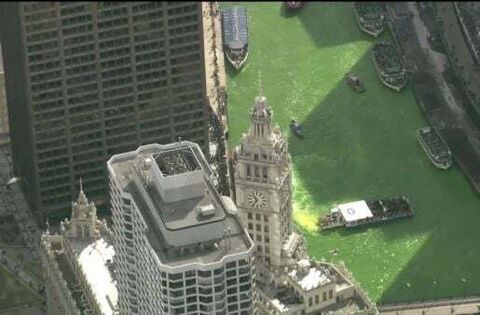 Ahead of Chicago’s parade, thousands of people, many decked out in green with beers in hand, gathered along the Chicago River to watch the local plumbers’ union boats turn the water green.