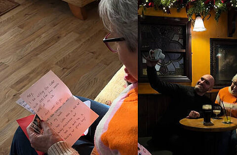 Charlie’s Bar in Enniskillen returned on Friday with the advert showing an upset elderly woman reading a handwritten letter from her late husband, featuring black and white overlays of her memories with him, before sitting with her son and granddaughter at the bar.