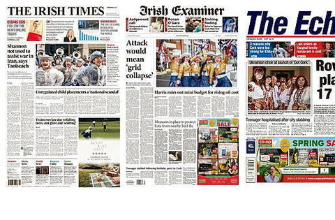 Monday's front pages focus on a range of stories, from the Taoiseach saying Shannon Airport is not being used to assist the war in Iran to an attack on energy infrastructure leading to a collapse.