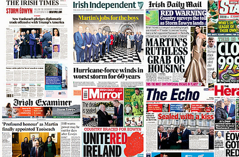 This morning's Irish Examiner focuses on the return of Cork's Michéal Martin to the officer of Taoiseach, while warning of extensive power cuts that could last for days as a result of Éowyn.
