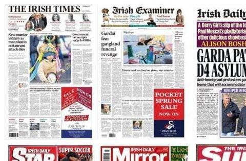 The death of Jason Hennessy Snr (48) following the Blanchardstown shooting makes the front page of The Irish Times, Irish Examiner and Irish Independent.