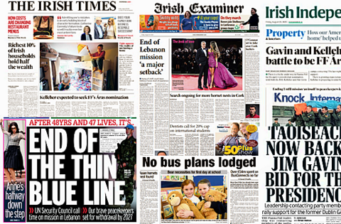 The race to be Fianna Fáil's candidate for the presidential election and the end of the UN peacekeeping mission in Lebanon makes the front pages of Friday's papers.