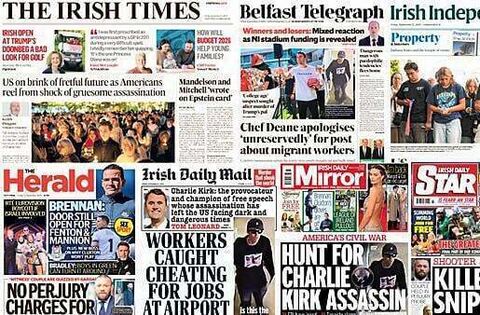The Irish Daily Mirror, Irish Daily Star and Irish Independent all lead with the killing of right-wing US activist Charlie Kirk and the hunt for his killer after he was shot at a conservative youth rally at a university in Utah.