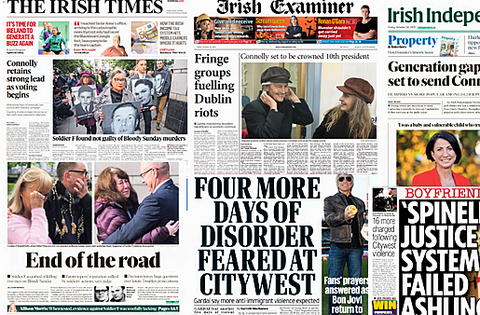 The Irish Times leads with Catherine Connolly retaining a strong lead in the opinion polls as voting begins in the Presidential election.