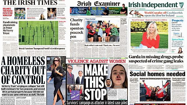 The Irish Times leads with fundraising for the Peter McVerry Trust falling from €15 million in 2022 to €2 million in 2025.