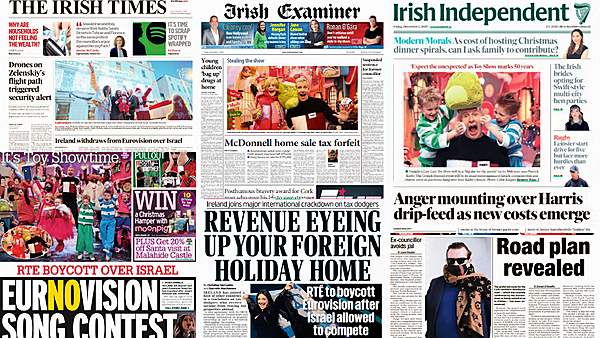 The Irish Daily Mirror and the Irish Daily Star lead with RTÉ boycotting the Eurovision due to Israel's involvement.