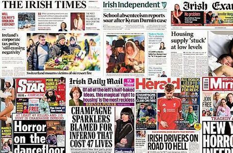 The Irish Daily Mail, Irish Daily Mirror, and Irish Daily Star all lead with a fire at a bar at a ski resort in Switzerland on New Year's Eve that killed more than 40 people and injured hundreds.