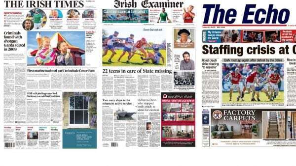 Monday's front pages focus on a range of stories from a shotgun which was seized by gardaí in 2009 ending up in the hands of organised crime to 22 teens in State care still missing.