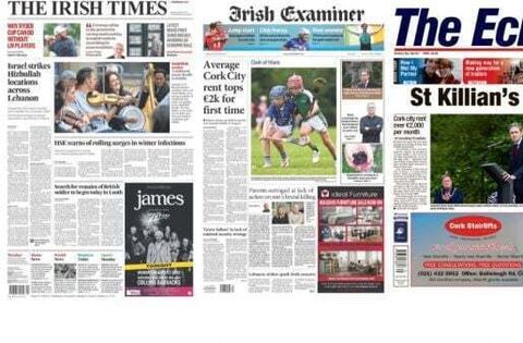 Monday's front pages focus on a range of stories from Israel striking Hizbullah targets in Lebanon to average rents in Cork city costing €2,000.