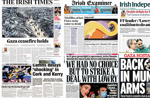 The ceasefire in Gaza and Micheál Martin defending the role of Michael Lowry in government formation talks make the front pages of Monday's papers.