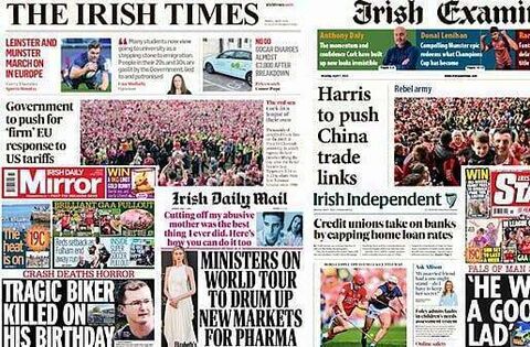 US President Donald Trump's tariffs, Cork's hurling league win, and Galway road deaths are among the stories on Monday's front pages.