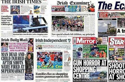 The news of a man's death and a girl's injuries following a shooting incident in a supermarket in Carlow town dominates the front pages of Irish newspapers on Monday.