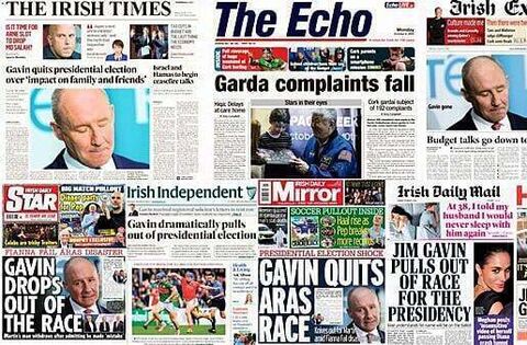 The decision of Fianna Fáil's presidential election candidate Jim Gavin to pull out of the race to Áras an Uachtaráin dominates the front pages of Irish newspapers on Monday.