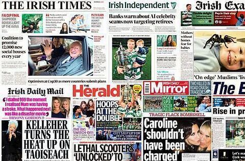 The Irish Independent lead with banks warning about AI celebrity scams targeting retirees.