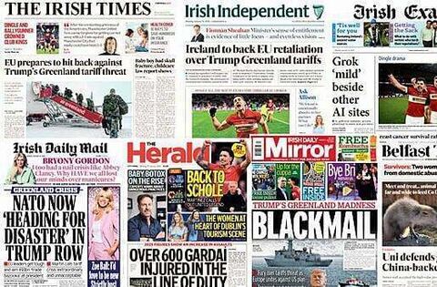 The Irish Times, Irish Daily Mail, Irish Independent, and Irish Daily Mirror all lead with Trump's ambitions to take over Greenland and hit allies with fresh tariffs.