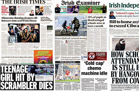 The Irish Times leads with the fatal shooting of Alex Pretti in Minneapolis, which widens the rift between the state and White House