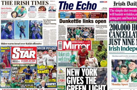 Meanwhile, The Echo marks the opening of the €215 million Dunkettle Intercharge, and joins many of the nationals in featuring an image from Ireland's 36-0 win over Italy at the Aviva on Sunday, showing Munster fly-half Jack Crowley crossing the whitewash to claim his first try of the tournament.