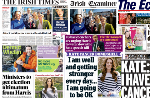 The Irish Daily Mail, the Irish Daily Mirror and the Irish Daily Star all lead with Britain's Princess Kate cancer diagnosis, which she announced in a video on Friday.