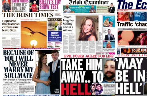 Josef Puska sentenced for the murder of Ashling Murphy, and attempts to get Irish citizens out of Gaza are the main headlines in Saturday's papers.