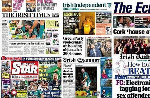 The Irish Times leads with Ireland coming out on top against Argentina in rugby, as well as the results of an opinion poll which indicated that voters would prefer a Fine Gael and Fianna Fáil coalition. Sinn Féin were shown to be the least-favoured party to be in government.