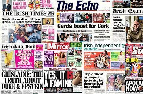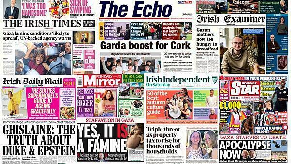 The Integrated Food Security Phase Classification (IPC) declaring that famine is occurring in Gaza City dominates the front pages of Irish newspapers on Saturday.