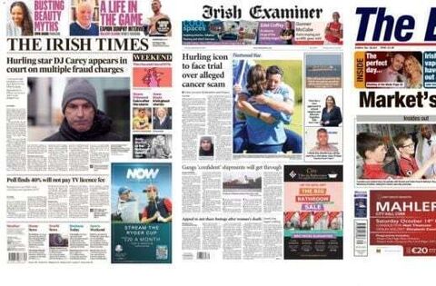 The Irish Times and Irish Examiner lead with the story that DJ Carey is to stand trial accused of deception and forgery by persuading 23 people to donate funds after fraudulently claiming he needed money for cancer treatment.