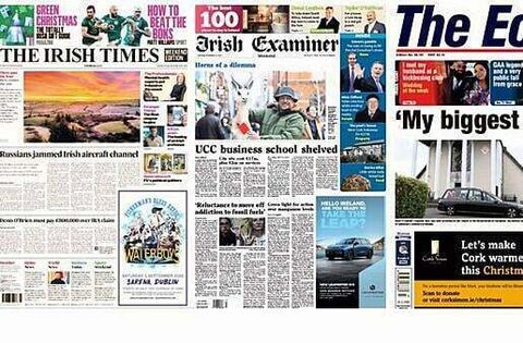 Saturday's front pages focus on a range of stories, from the Russian jamming of Irish aircraft channels to a proposed UCC School of Business being shelved.