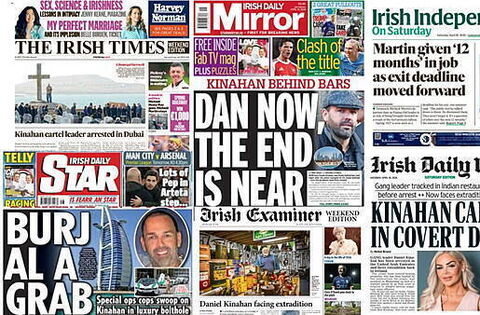 The Irish Daily Mirror also leads with mob boss Daniel Kinahan finally being behind bars after the police swooped on his Dubai bolthole – once the go ahead came from Ireland.