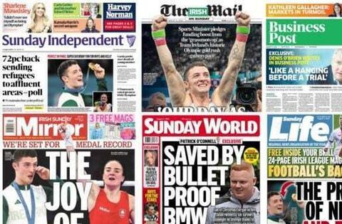 The Irish Mail on Sunday celebrates Ireland's "gold rush" after the medal wins for gymnast Rhys McClenaghan and boxer Kellie Harrington at the Paris Olympics on Saturday.