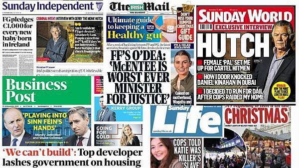 The Sunday World's front page also leads with a Gerry Hutch interview, in which we states that a female friend set him up for cartel hitmen, and how he decided to run in the general election after his home was raided.