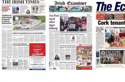 Thursday's front pages focus on a range of stories from the abolition of juries for High Court defamation actions being considered to a postmistress suing An Post after being a victim of a tiger kidnapping.